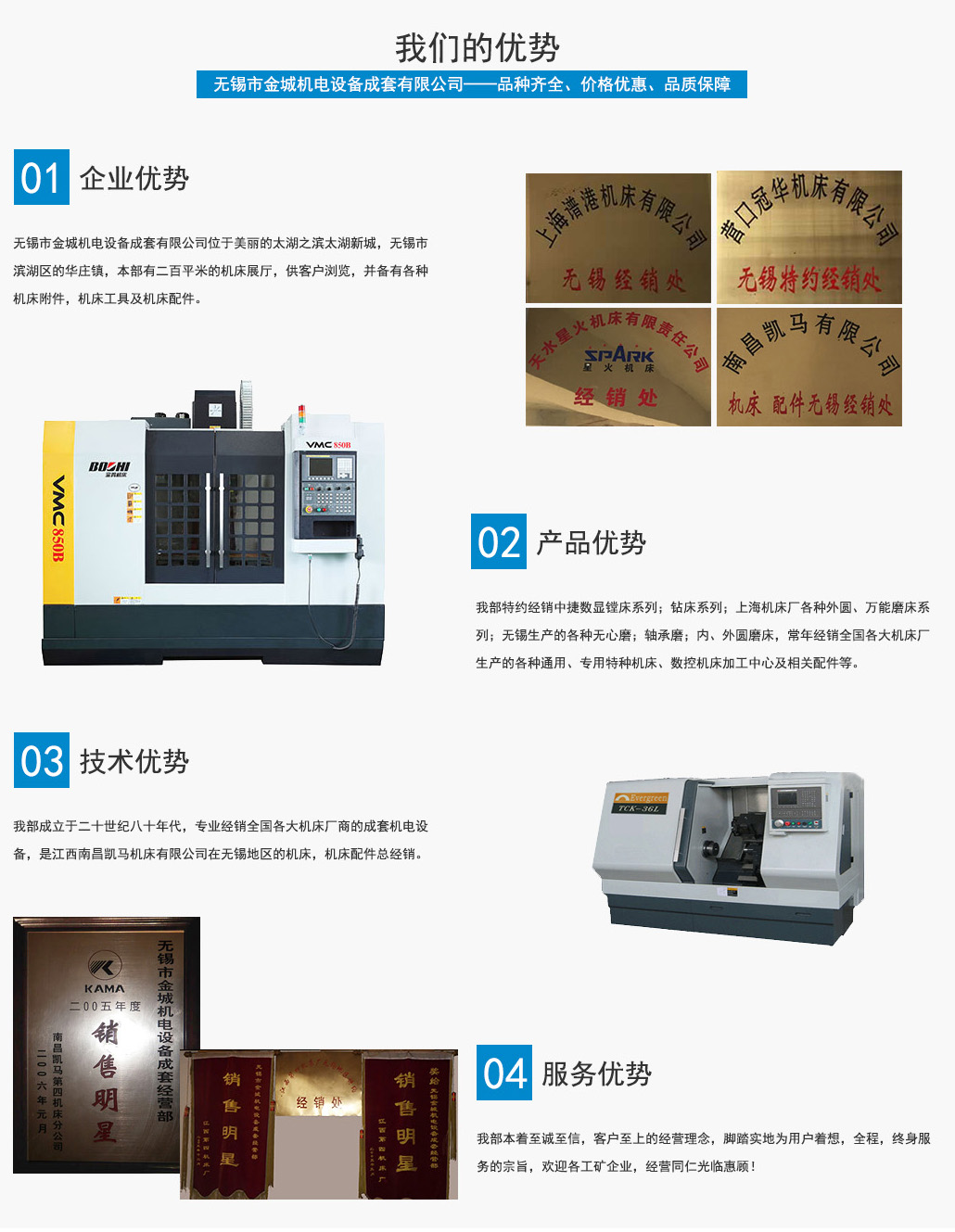 無錫市金城機電設備成套有限公司位于美麗的太湖之濱太湖新城,無錫市濱湖區(qū)的華莊鎮(zhèn),本部有二百平米的機床展廳,供客戶瀏覽,并備有各種機床附件,機床工具及機床配件。 我部成立于二十世紀八十年代,專業(yè)經(jīng)銷全國各大機床廠商的成套機電設備,是江西南昌凱馬機床有限公司在無錫地區(qū)的機床,機床配件總經(jīng)銷。系蘭州里海機床有限公司,天水星火...